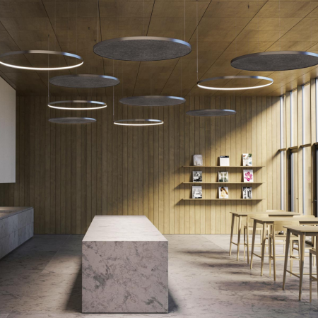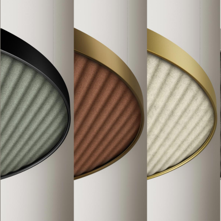 Horizontal suspension lamp, wall and ceiling lamp in extruded curved aluminum, with opal polycarbonate screen. Emission on the internal side is provided by LED modules with technology DALI/Push DIM integrated into the canopy. Polyacrylic paint white, black, titanium, bronze and mat brass finishes are available. Ideal for offices, halls, living, and public spaces, also combined with Zero Round Acoustic and Arena Acoustic.